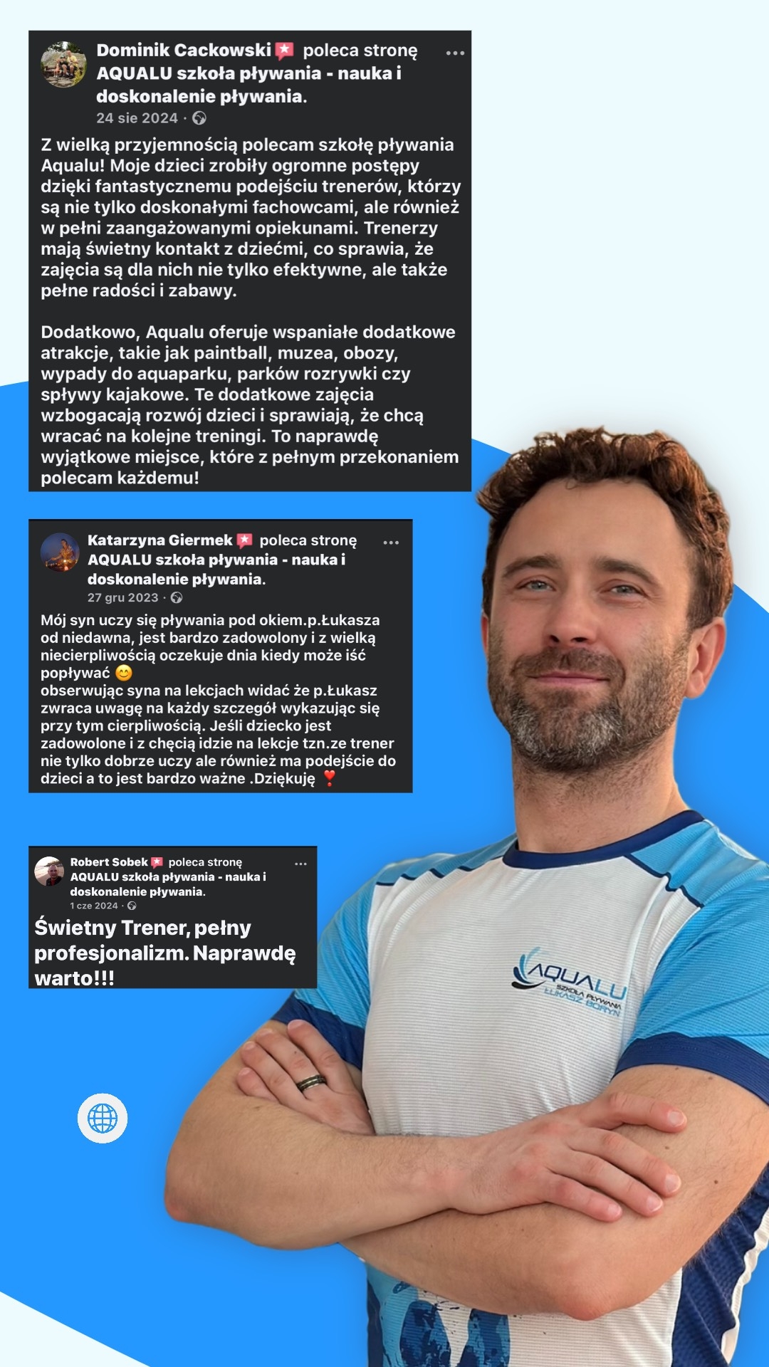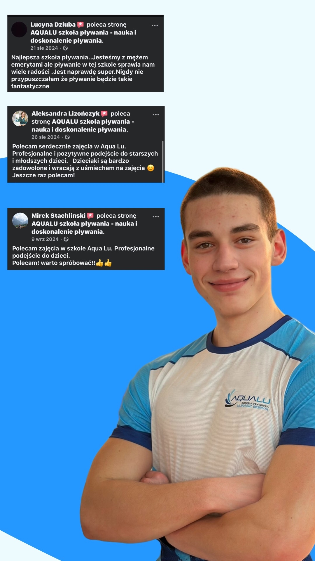 Nazywam się Łukasz Boryn i gwarantuję Ci, że pływanie stanie się dla Ciebie nie tylko umiejętnością. Od niemal 17 lat uczę tej dyscypliny dzieci, młodzież i dorosłych. Niezależnie od tego, czy dopiero zaczynasz swoją przygodę z wodą, czy jesteś zaawansowanym pływakiem przygotowującym się do zawodów, pomogę Ci osiągnąć zamierzone cele i rozwinąć Twoje umiejętności.